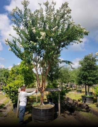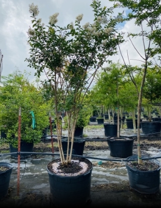 Crape Myrtle | Natchez Natchez Attribute of Natchez White Blooms all summer long Mature height 20+ feet Large tree or bush Best planted in groups, lined planting, or focal point in landscape. Drought tolerant. A full sun lover. Example of Sizes 45 Gal 200 Gal